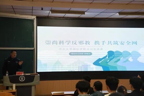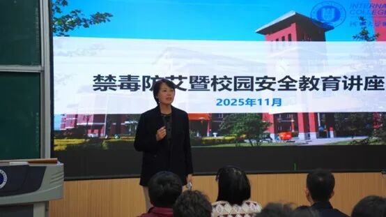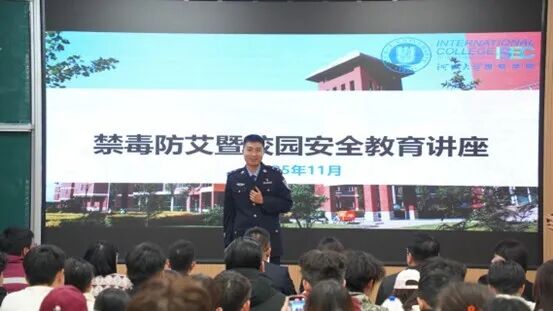 为筑牢校园安全防线,切实提升学生的自我保护意识,11月6日,国际学院联合河北省保定强制隔离戒毒所、保定市公安局、保定市疾病预防控制中心共同举办校园安全主题教育活动。民警姬劭宸、李晓光、王泽前以及疾病预防控制中心刘梓庭分别开展讲座,国际学院团委书记/学工办主任王建慧、辅导员王志云及2023级、2024级和2025级各班班长、生活委员和安全委员参加了本次活动。