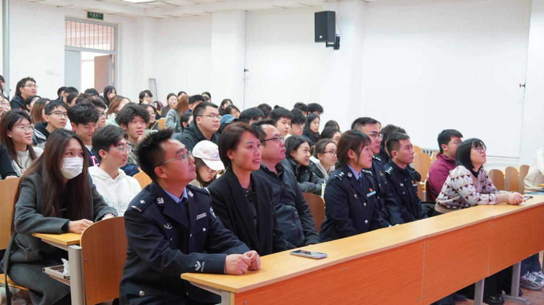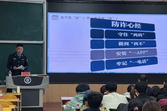在之后的安全教育讲座环节,民警王泽前同志对电信诈骗的常见手法与识别技巧进行剖析,分享手机盗窃真实案例,增强同学们防盗意识,为同学们构筑起一道坚实的理论防线。