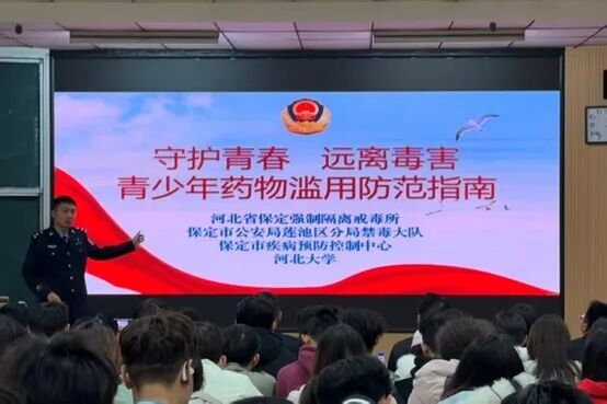 紧接着是室内专题讲座。民警姬劭宸同志围绕“禁毒”展开了详细的讲解。从毒品的基本概念与分类入手,重点剖析了新型毒品的危害性,并提供了实用的防范策略。